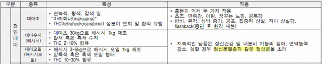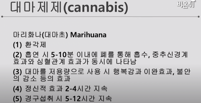 반면에 대마는 흡입하여 섭취하므로 바로 5~10분후에 환각상태에 도달하게 되고