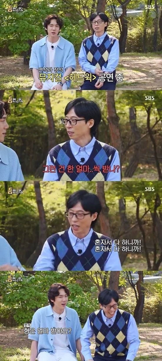 이를 듣고 있던 유재석은 "궁금해서 그러는데, 그런건 얼마 정도 받냐. 혼자 다 하는거 아니냐"고 돌직구 질문을 던졌다.