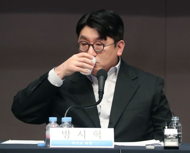 물 마시는 하이브 의장 방시혁 / 뉴스1
