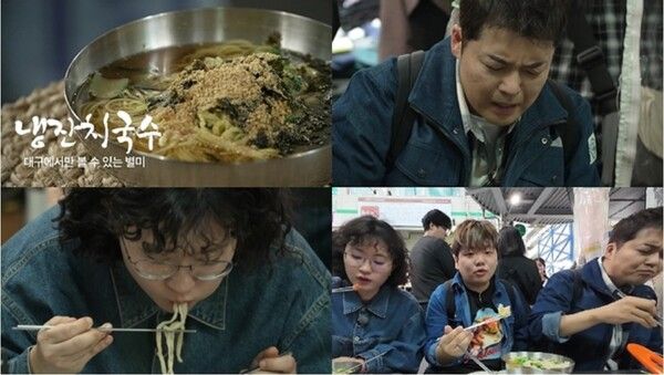 '진' 옷을 입은 세 사람은 서문시장 명물 '칼국수 거리'를 찾는다. 직접 반죽한 뒤 손으로 밀고 썰어 만든 면과 특별한 소스가 조화를 이루는 '섞어' 메뉴를 맛본 전현무, 곽튜브, 원지는 "세상에! 너무 쫄깃쫄깃해!" "떠껀(따끈)~하고 얼컨(얼큰)~하고 좋다" "히트다! 입에서 잔치가 일어났다" 등 극찬을 쏟아낸다.