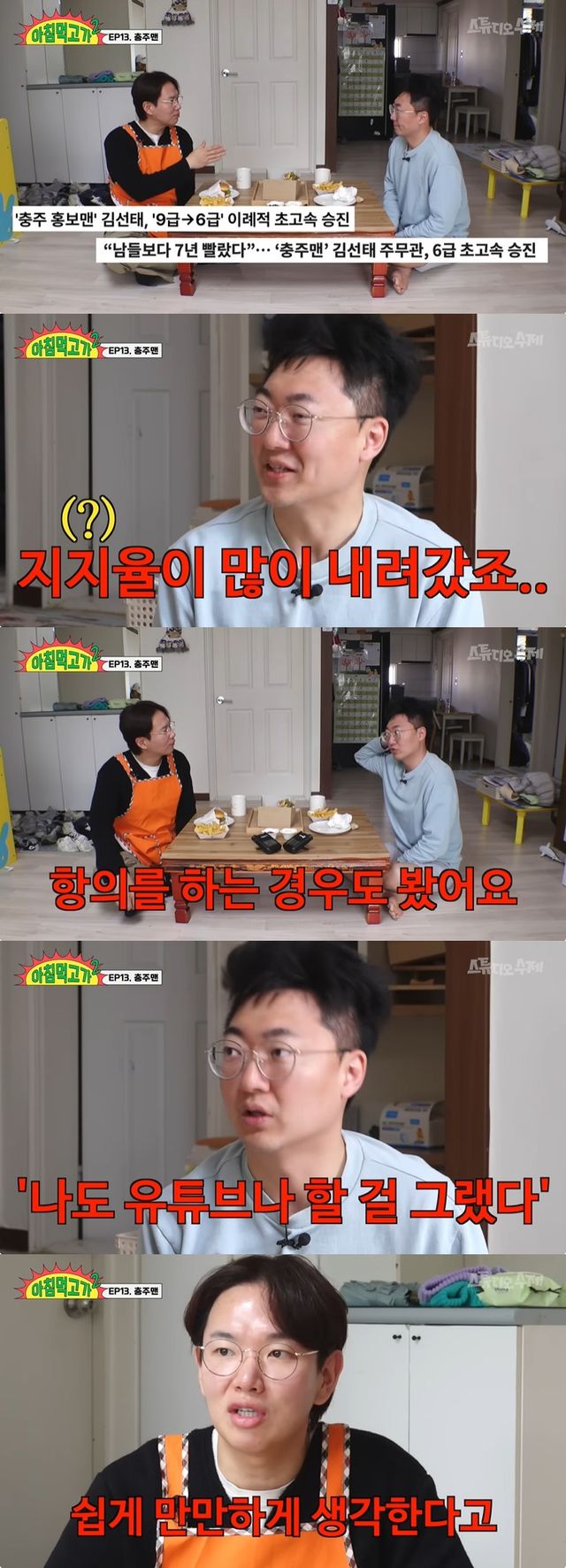 이에 장성규는 "이렇게 특급 승진했을 때 동료들 반응은 어땠느냐"고 물었고 김선태는 "지지율이 많이 내려갔다. 시청 내 지지율이 보통 30% 이상은 됐다고 생각했는데 이제 한 15%~20%로 많이 떨어졌다"고 전했다.