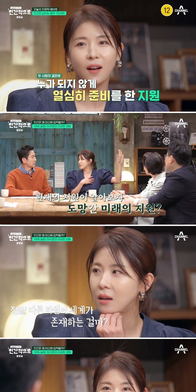 지난 1일 방송된 채널A 교양프로그램 ‘인간적으로’에 하지원이 첫 번째 ‘호기심 메이트’로 출연해 활약을 펼쳤다. 이날 하지원은 ‘연예계 찐친’ MC 신동엽과 반가운 인사를 나누며 등장한 뒤, ‘지식 셀럽’ 4인방 영화 평론가 이동진-정치학자 김지윤-뇌과학자 장동선-공학 박사 곽재식을 만나 “대단하신 분들과 이야기를 나누는 게 신나면서도 긴장된다”며 배움을 향한 의지를 드러냈다.