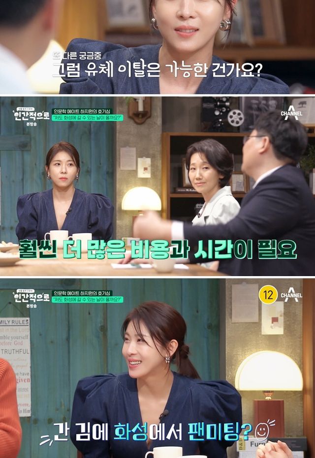 이날 하지원은 연예계 공식 ‘우주 덕후’로서, “언젠가 화성에 갈 수 있을까요?”라는 질문을 던졌다. 하지원은 “미국의 화성 탐사 연구와 모의 훈련이 이뤄지는 기지에서 일주일 동안 우주인들과 똑같이 생활한 적이 있다”며 “그곳에서 죽어도 괜찮으니, 화성에 꼭 가보고 싶다”는 간절한 소망을 드러냈다. 그러나 ‘지식 셀럽’들은 “현재의 기술로는 우리 세대에는 어렵고, 인간이 화성에 가는 모습을 보려면 반드시 ‘장수’해야 한다”는 대답을 내놨다. 다만 “정착을 하려면 여러 명이 함께 가야 한다”는 이야기에 하지원은 “팬들과 함께 떠나 화성에서 ‘팬미팅’을 진행해 보겠다”는 야망(?)을 드러내 웃음을 선사했다.