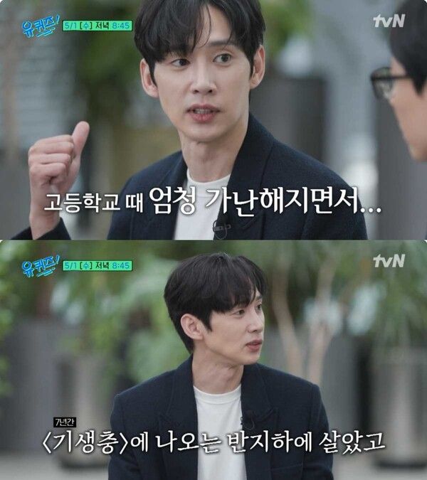 10년간 연극무대에 올랐던 그는 “처음엔 1년간 5만원을 벌었다. 그때 ‘기생충’에 나오는 것 같은 지하방에 7년 정도 살았다. 장마철에 역류하면 물을 퍼내기가 힘들어서 솜이불에 빗물을 적셔 퍼내기도 했다”라고 말했다.