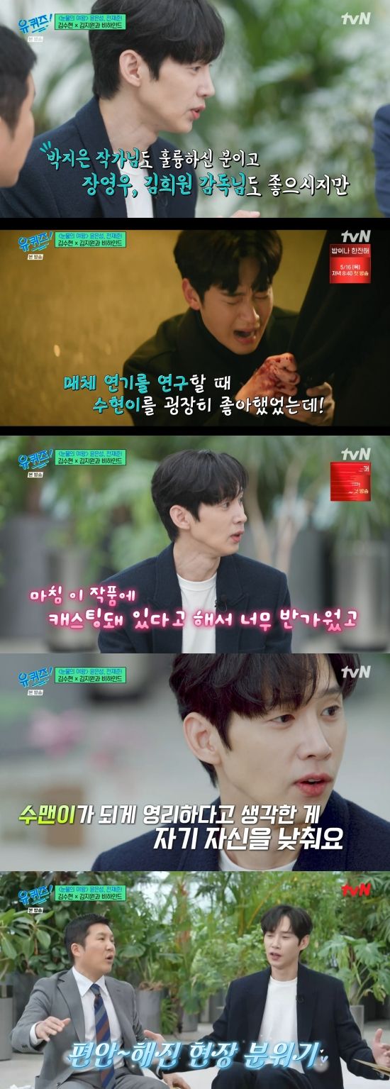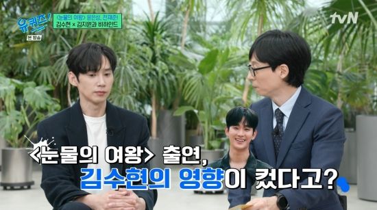 유재석은 "'눈물의 여왕' 출연 계기가 김수현 씨의 영향이 좀 컸다더라"라며 궁금해했다. 박성훈은 "기본적으로 박지은 작가님도 너무 훌륭하신 분이고 장영우, 김희원 감독님도 평판이 좋으신 분이기도 했지만 개인적으로 수현이가 저보다 나이는 어리지만 굉장히 어릴 때부터 활동을 하고 주연 생활을 되게 오래 하지 않았냐. 연극 판에 있다가 드라마로 넘어올 때 수현이 연기도 참고했다"라며 털어놨다.