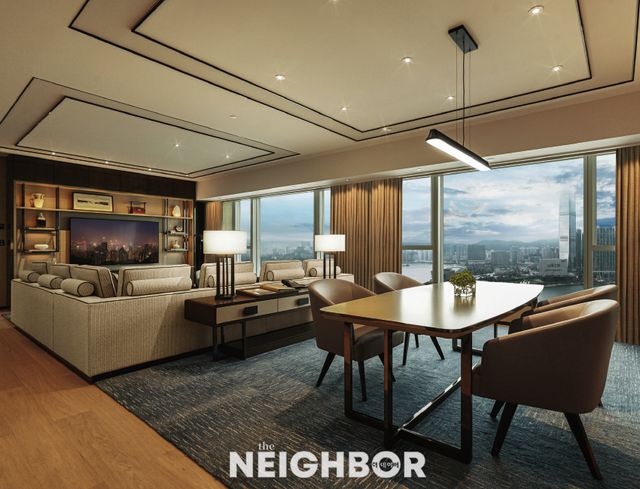 빅토리아 하버 전경을 내려다볼 수 있는 디럭스 스위트. 탁 트인 전망과 부드러운 톤의 인테리어가 완벽한 조화를 이룬다.