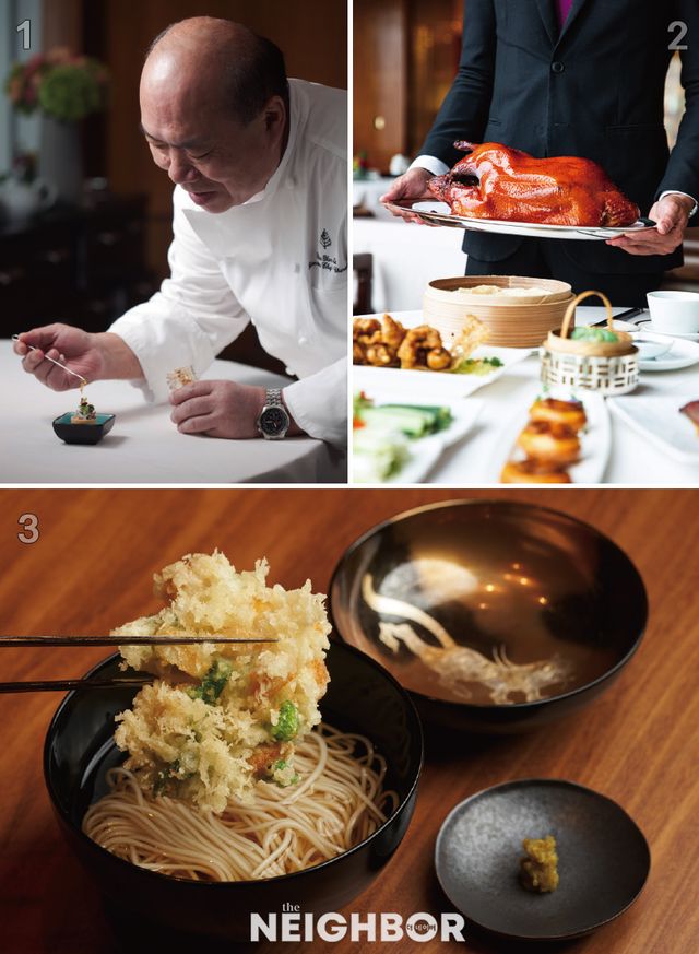 1 세계 최초로 미쉐린 3스타를 획득한 중식당 ‘룽킹힌’의 이그제큐티브 중식 셰프 찬얀탁. 2 룽킹힌의 시그너처 메뉴 로스트 페킹덕. 3 전 세계에서 공수한 신선한 제철 재료를 일본 전통 요리법으로 조리하는 덴푸라 오마카세, ‘덴푸라 우치츠’. 깔끔한 맛이 일품인 베이비 스캘럽 누들.