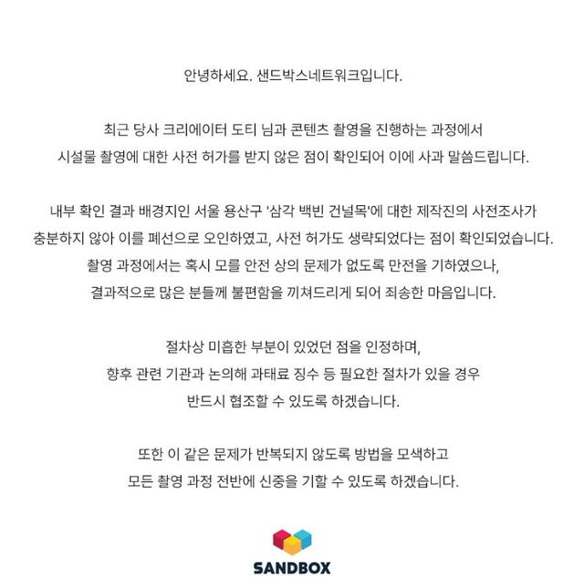 최근 당사 크리에이터 도티 님과 콘텐츠 촬영을 진행하는 과정에서, 시설물 촬영에 대한 사전 허가를 받지 않은 점이 확인되어 이에 사과 말씀드립니다.