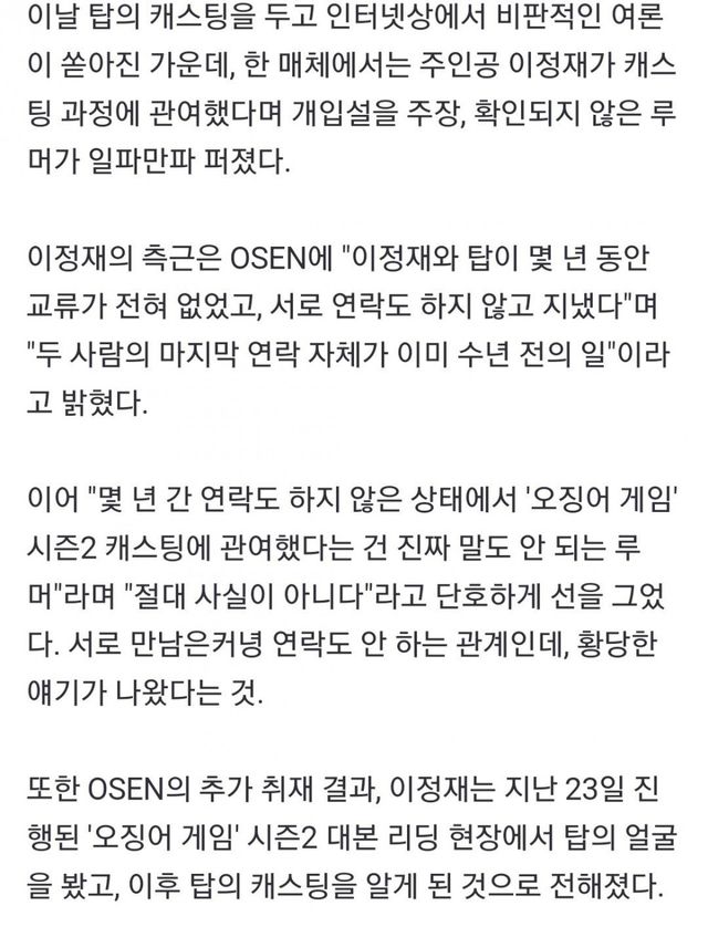 이정재는 소속배우 끼워팔기도 안하고 몇년동안 탑과 교류도 없었고 대본 리딩때 처음 캐스팅 알았는데 디스패치 오보기사로 혼자 욕 다쳐먹음