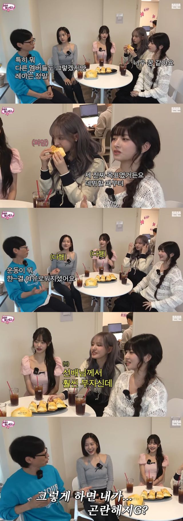 안유진은 연습생 때를 마지막으로 봤다고 대답했고, 레이는 정산 날 회사에서 만났다고 말을 이었다.
