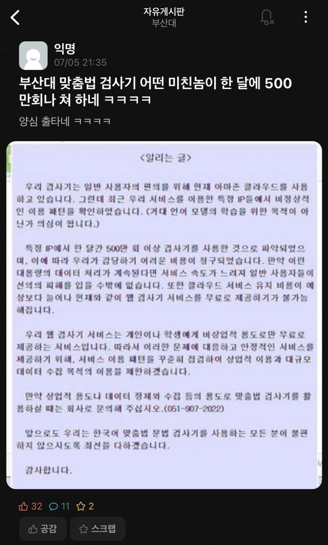 누군가가 맞춤법 AI 딥러닝 꽁으로 얻어처먹을라고 이 사이트에서 500만 회 이상의 맞춤법 검사를 했고