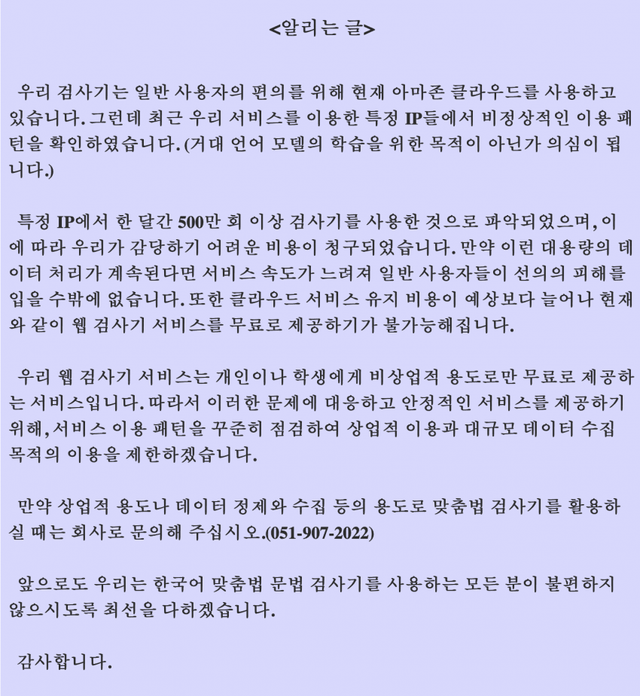 일단은 특정 IP의 과다한 검사기 사용을 차단하는 방식으로 대처할 것이라고