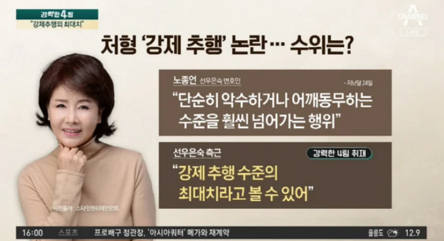 강제추행 수위에 대해 '강력한4팀' 측은 선우은숙 측근을 인용해 "강제추행 수준의 최대치라고 볼 수 있다"라고 전했다.