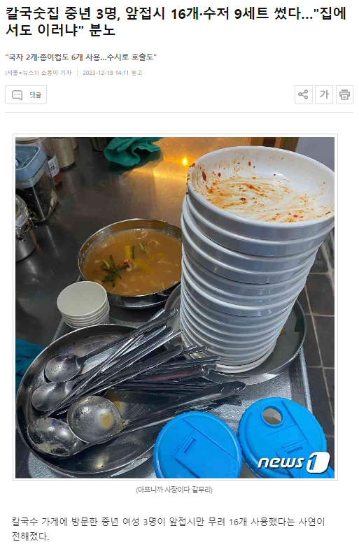 이어 "손님들은 식사를 마치고 이야기꽃을 피우시더니 꽃이 다 지고 열매가 익을 때까지 말씀을 나누시더라"라며 "계산을 하고 간 뒤 경악을 금치 못했다. 테이블에 수저, 국자, 앞접시가 꽉 차 있었다"고 주장했다.
