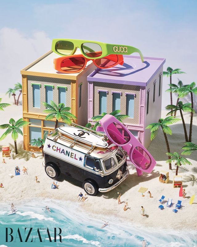 첫 번째 도착지는 바닷가. 뜨거운 햇살 아래 필수인 선글라스는 컬러풀한 아세테이트 소재를 제안한다. 착용한 채 물에 풍덩 빠져도 문제없으니. 서핑보드를 싣고 여행을 떠나는 밴 모티프 가방으로 위트를 더해보자.