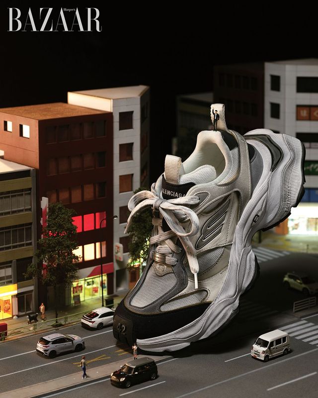 야심한 밤, 인적이 드문 도시로 향한다. 도시를 가로지르며 달리기 좋은 스니커즈 위로 달이 스포트라이트를 비춘다. 투박한 어글리 스니커즈는 캐주얼한 룩뿐만 아니라 우아한 이브닝드레스와 어우러져도 반전 매력을 준다.