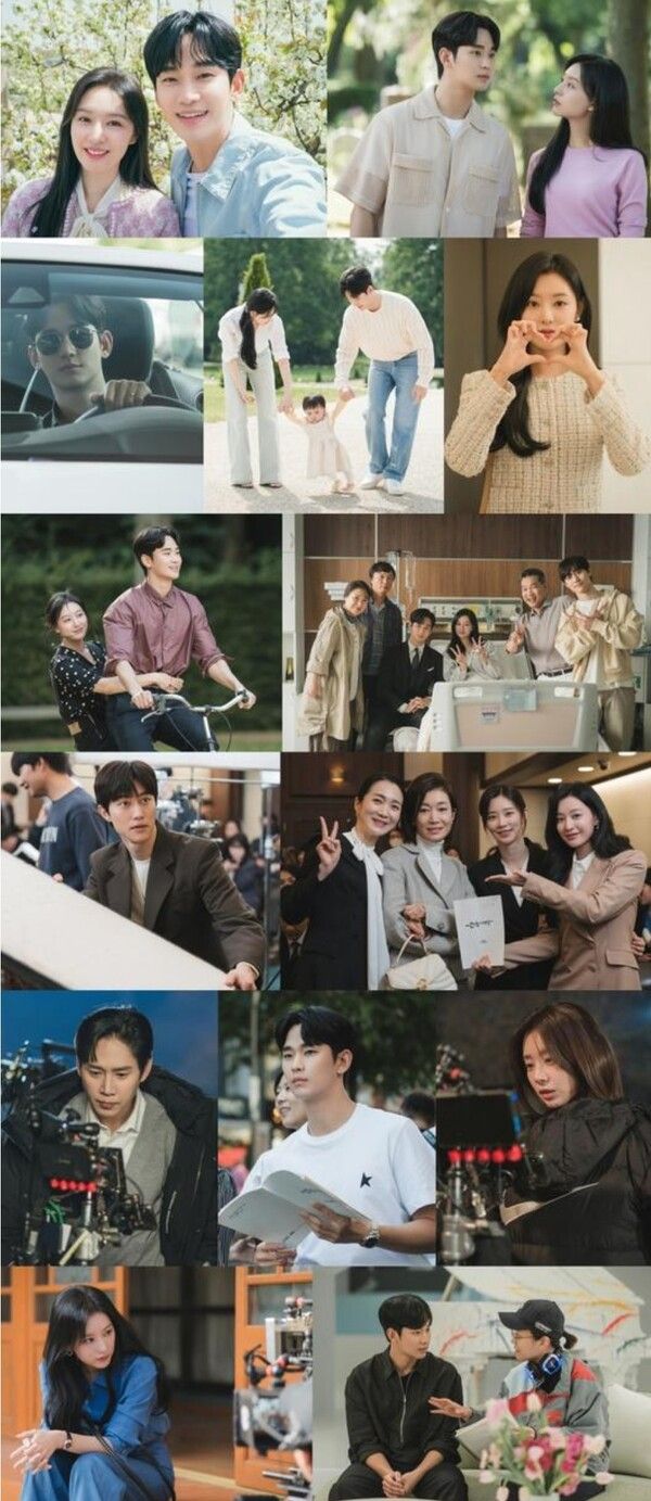 사진 속에는 극 중 백현우(김수현 분)와 홍해인(김지원 분) 부부로 호흡을 맞춘 두 배우의 모습이 담겨 있다. 얼굴을 맞대고 환한 미소를 띠며 셀카를 찍는 모습부터 함께 자전거를 타고 바람을 느끼는 모습까지, 신혼 부부로서의 달콤한 케미가 돋보인다. 특히, 아기와 함께 산책하는 백현우-홍해인 가족의 단란한 모습은 보는 이들의 마음을 따뜻하게 한다.