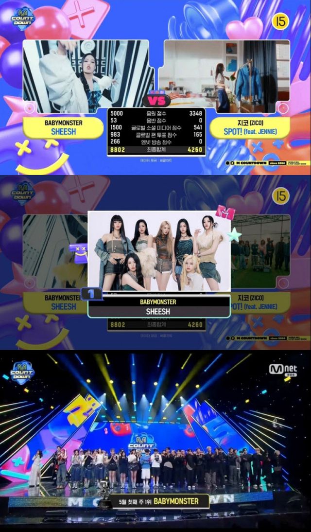 2일 오후 방송된 엠넷 ‘엠카운트다운’에서 베이비몬스터는 타이틀곡 ‘쉬시’(SHEESH)로 5월 첫째 주 1위를 차지했다. 공식 활동이 마무리됐음에도 큰 격차로 음원, SNS, 팬 투표 등 부문에서 고루 높은 점수를 받은 결과다.