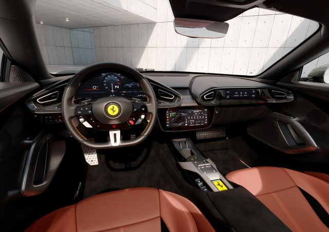 인테리어 스타일은 페라리 듀얼 콕핏 구조에서 영감을 받았다. 이 레이아웃은 페라리 로마와 로마 스파이더, 그리고 페라리 푸로산게에 적용된 바 있다. 운전자와 탑승자를 위한 두 개의 모듈로 이뤄진 12실린드리의 캐빈은 거의 대칭적인 구조로 이뤄져 있으며, 놀라운 수준의 편안함과 더불어 몰입감 높은 드라이빙을 경험할 수 있다.