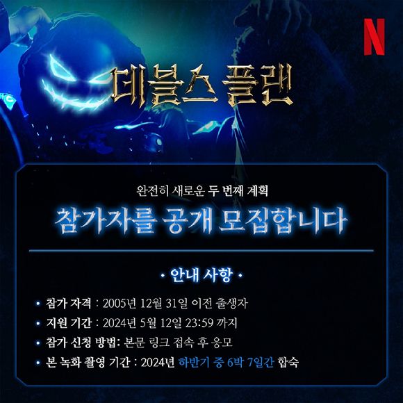 [조이뉴스24 정지원 기자] 테오(TEO) 정종연 PD가 제작하는 넷플릭스(Netflix) 예능 '데블스 플랜'이 시즌2 참가자 공개 모집을 시작한다.
