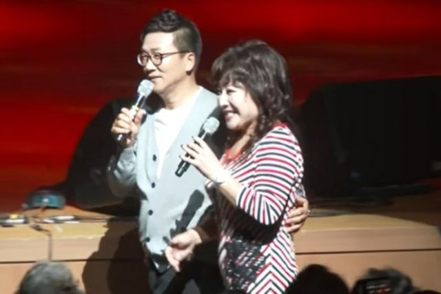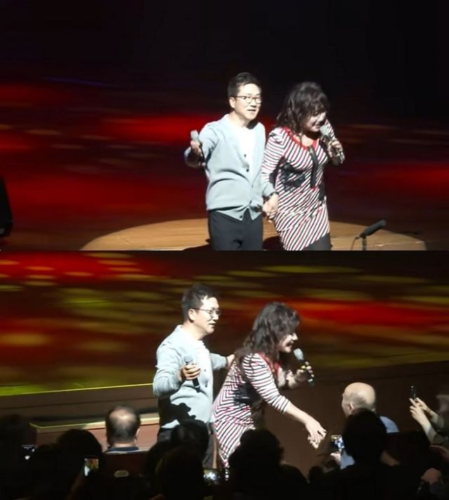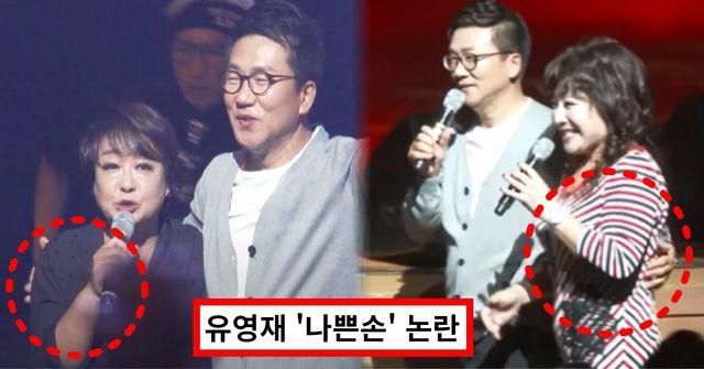 뿐만 아니라 유영재는 가수 혜은이의 무대에서도 스킨십을 이어갔습니다. 그는 혜은이의 어깨를 감싸 안거나 손을 잡고 허리손을 했습니다.