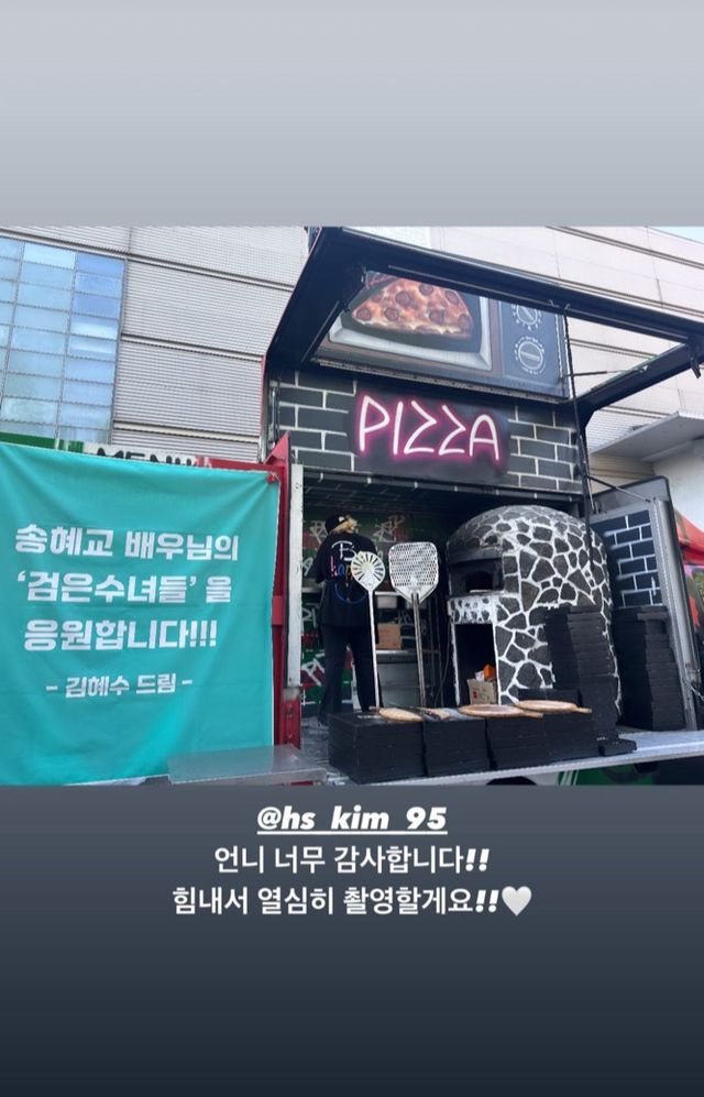 김혜수가 송혜교에게 보낸 간식차에는 '송혜교 배우님의 '검은 수녀들'을 응원합니다!!!'라는 문구가 새겨져있다.