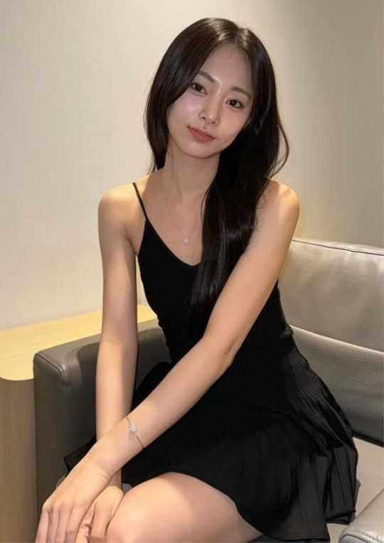 공개된 사진에는 블랙 민소매 원피스를 입은 쯔위의 모습이 담겼다. 너무 마른 몸매가 눈길을 끈다.