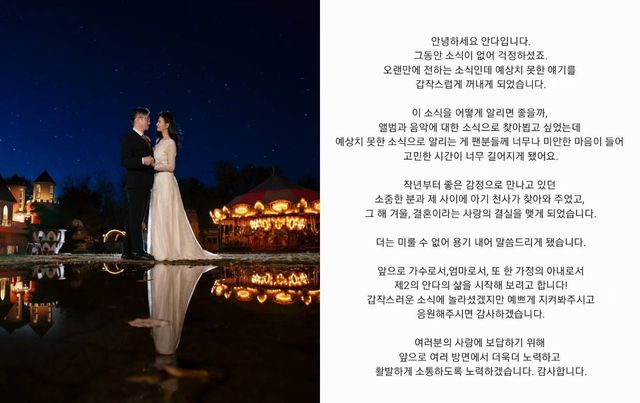 이어 "아기 천사가 찾아와 주었고, 그 해 겨울 결혼이라는 사랑의 결실을 맺게 되었다"며 "더는 미룰 수 없어 용기 내어 말씀드리게 됐다"고 전했다.