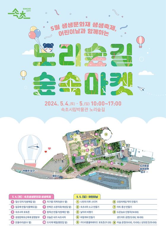숲속마켓과함께5월4일개최되는속초문화재생생축제는속초문화재를활용한다양한체험과강원도무형문화재인속초도문농요와속초사자놀이공연이진행되며,5월5일어린이날행사는오징어게임딱지만들기,나만의타투문신,아트풍선만들기,바람개비만들기,날아라비행기,샌드아트공연,마술공연,속초시립풍물단키다리상모판굿등다양한체험과공연이펼쳐질예정이다.