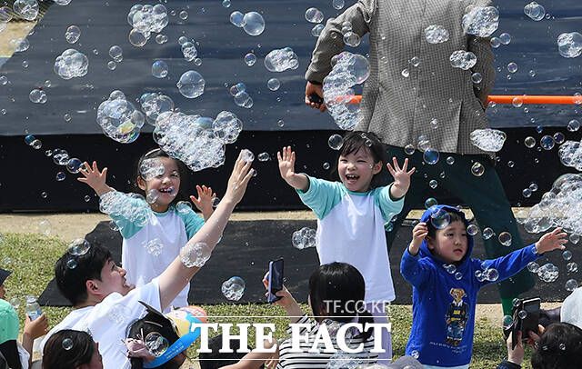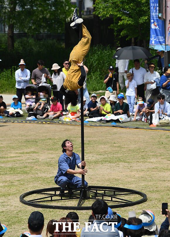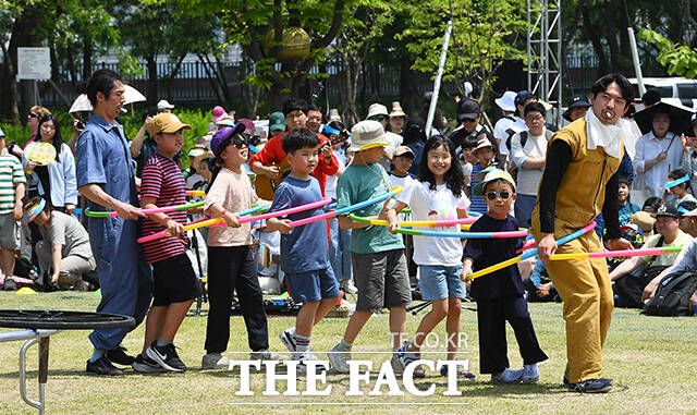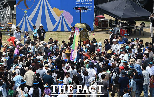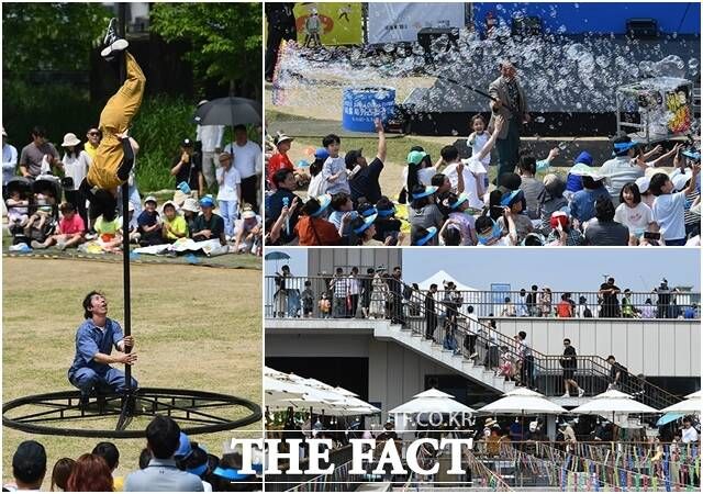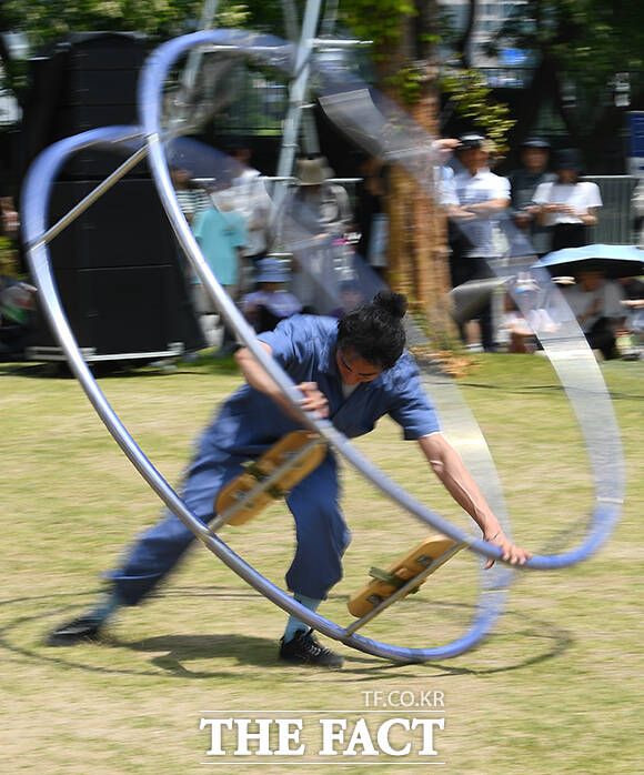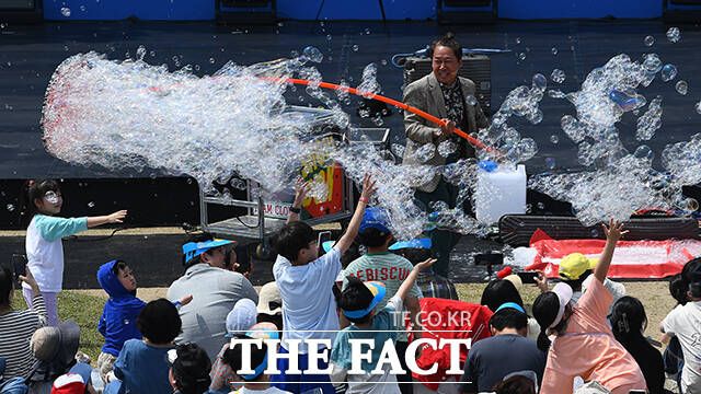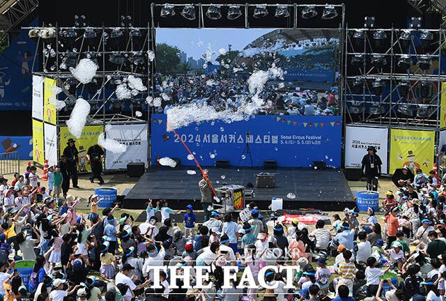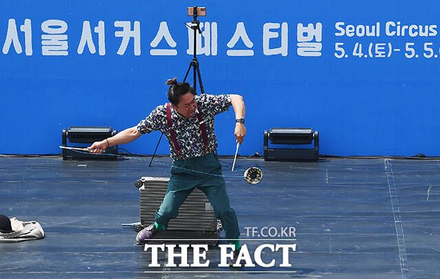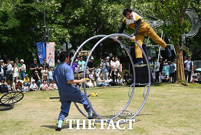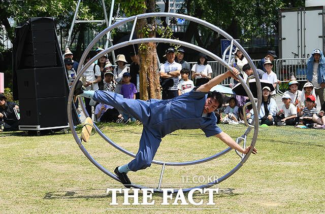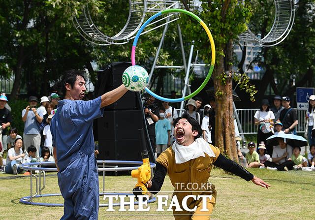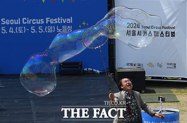 [더팩트ㅣ이동률 기자] 서울 서커스페스티벌이 개막한 4일 오후 서울 용산구 노들섬에서 '원구자들'과 '경상도 비눗방울' 공연이 열리고 있다.