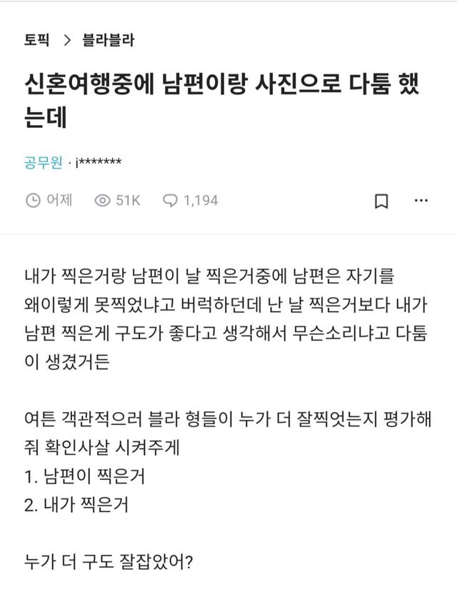 실시간으로 댓글 달리는 중인데 잠깐 보니까 남편이 찍은게 좋다는 댓글이 훨씬 많음…