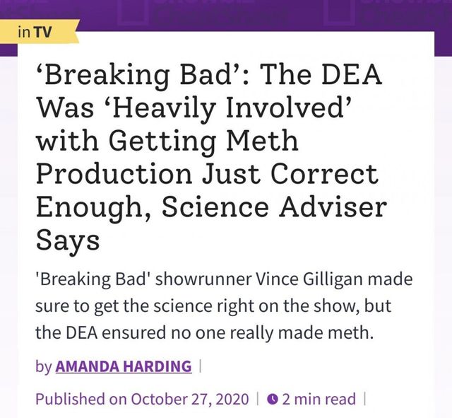 왜냐면 DEA(미국 마약단속국) 요원들이 월터 화이트와 제씨, 두 배우에게 제조법을 직접 가르쳤기 때문에…ㄷㄷ