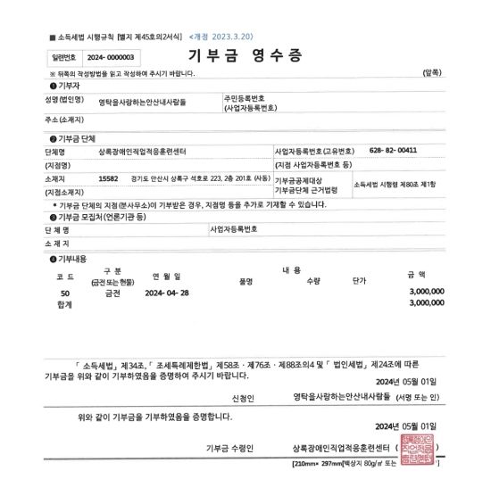 최근 영탁 팬클럽 '안산내사람들'은 5월 13일 가수의 생일을 기념해 발달장애인 직업재활 시설인 상록장애인직업적응훈련센터에 300만 원의 후원금을 전달했다고 밝혔다.
