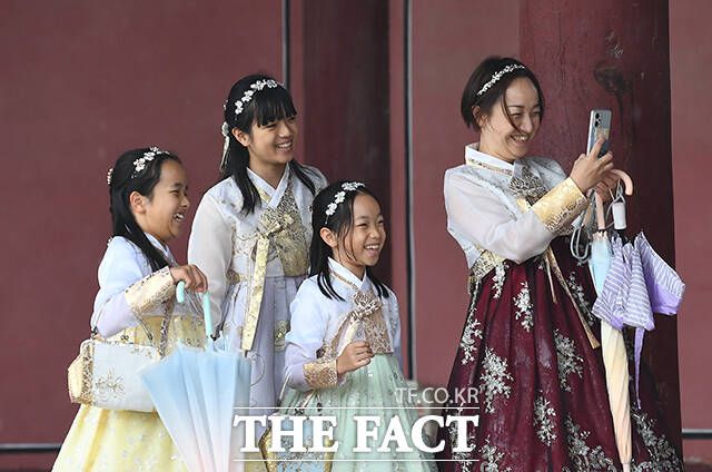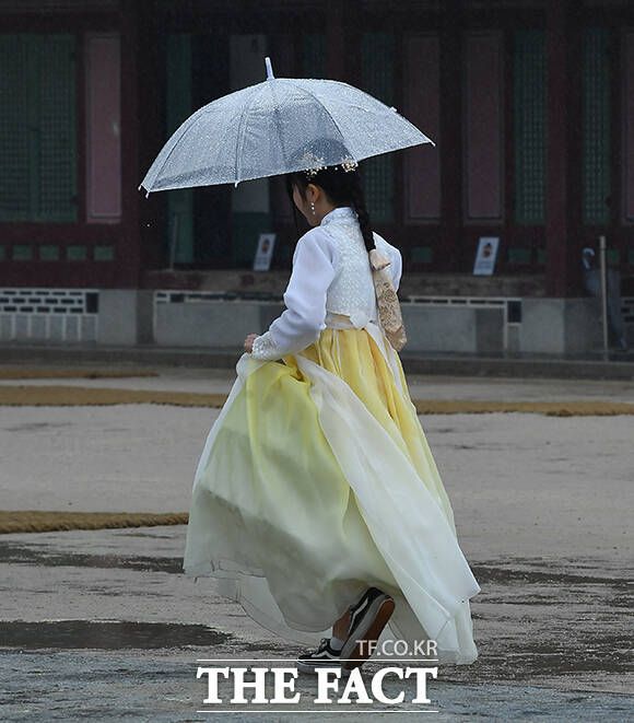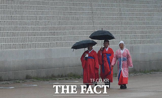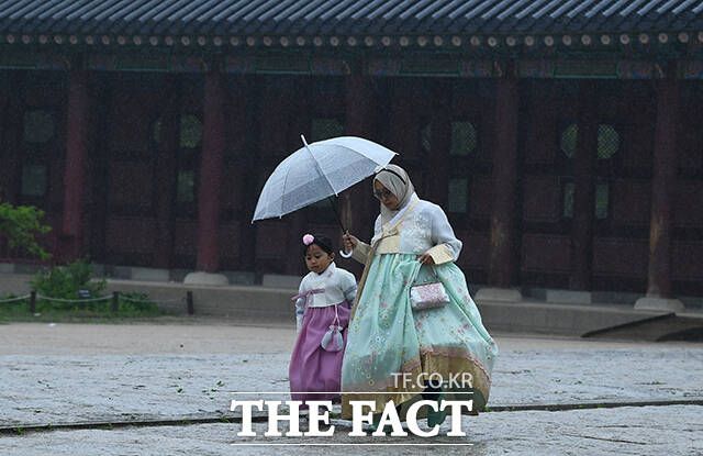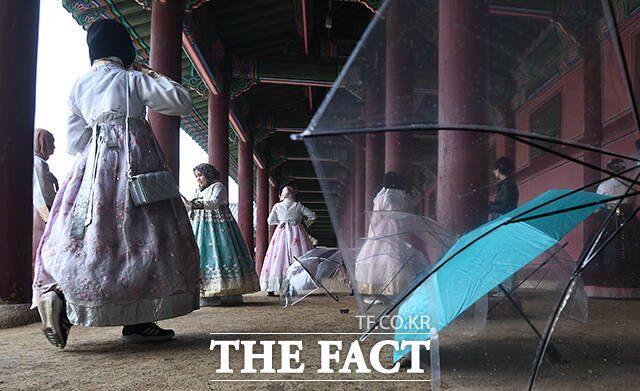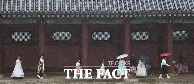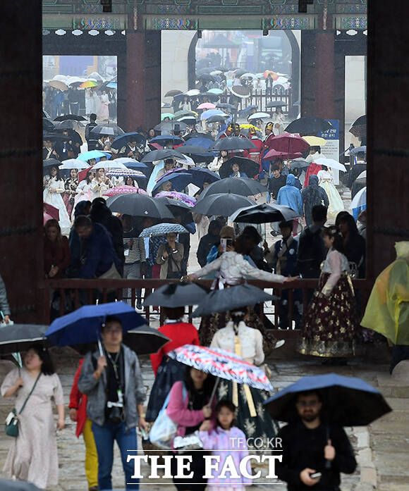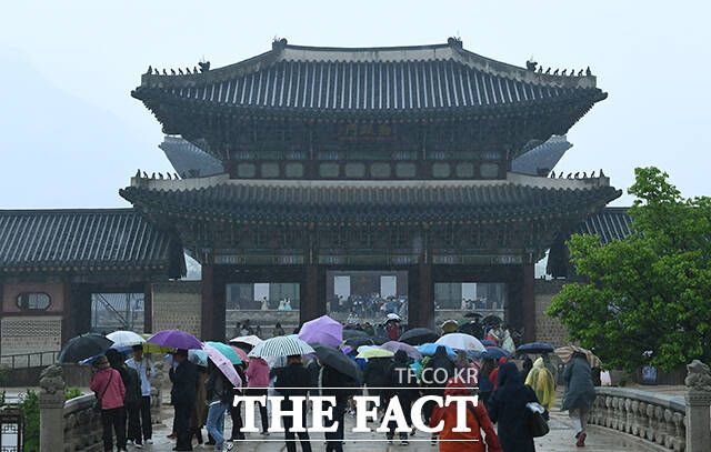 [더팩트ㅣ이동률 기자] 전국적으로 비가 내리는 5일 오전 서울 종로구 경복궁을 찾은 관광객들이 우산을 쓰고 관람을 하고 있다.