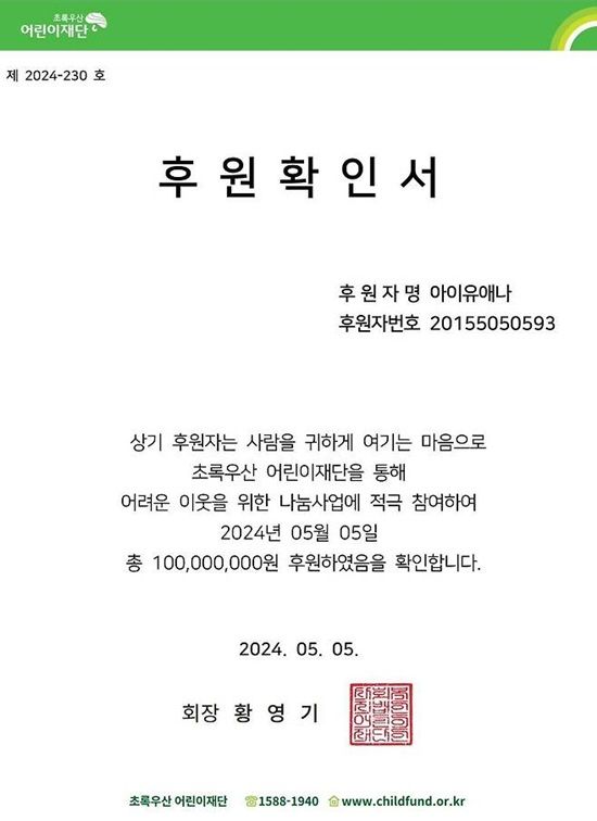 후원확인서에 따르면 아이유는 어린이날을 맞아 초록우산 어린이재단에 1억 원을 기부했다. 후원자명은 이번에도 아이유와 팬클럽 명 유애나를 합친 '아이유애나'라고 적혀 눈길을 끈다.