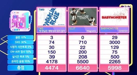 아일릿은 이날 온라인 음원 점수에서 5500점을 얻으며 총 6640점으로 1위에 올랐다. 2위는 베이비몬스터(5998점), 3위는 투어스(4474점) 순으로 집계됐다.