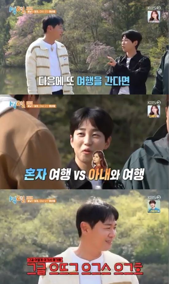 김종민은 연정훈을 향해 "무슨 행복한 일이 있었던 거냐. 집만 떠나면 얼굴이 좋아지는 거냐"고 물었다.