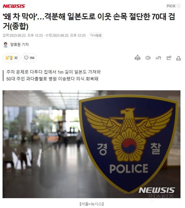 출처 : ‘왜 차 막아’…격분해 일본도로 이웃 손목 절단한 70대 검거(종합) (naver.com)