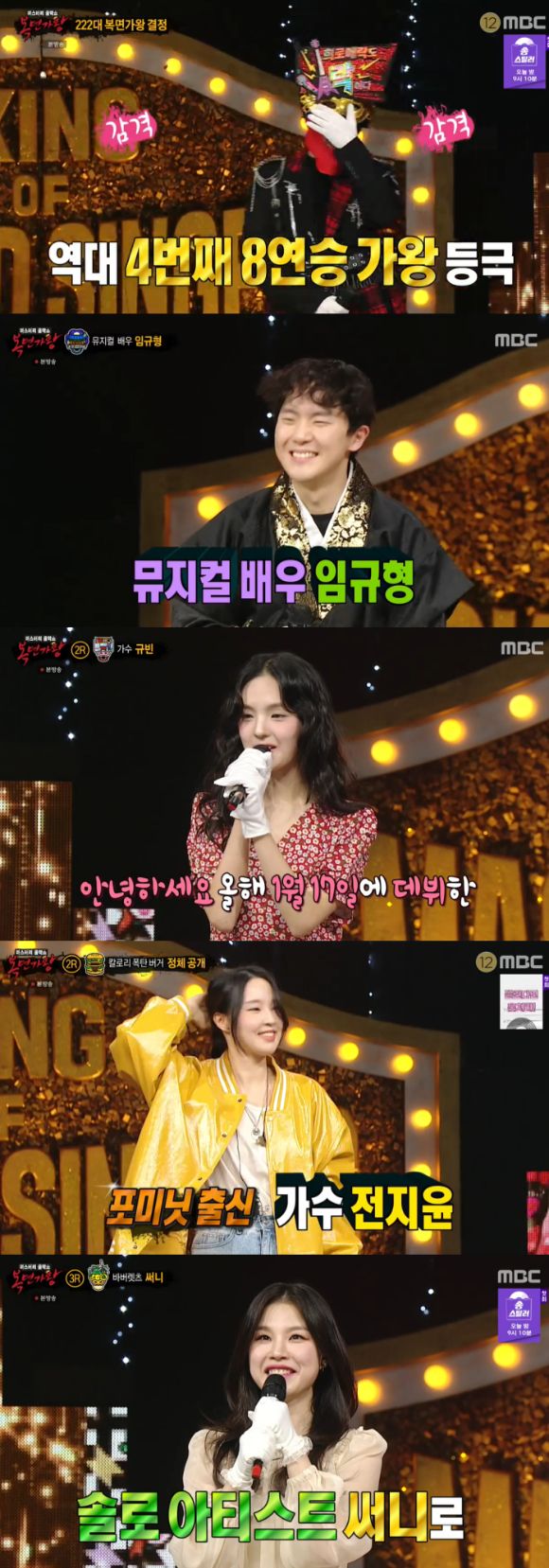 이날 '복면가왕' 무대에서는 가왕전에서 아쉽게 패한 '야간개장' 임규형을 비롯해 '폭탄세일' 가수 규빈, '칼로리 폭탄버거' 포미닛 출신 전지윤, '풍력발전기' 바버렛츠 출신 써니 등이 복면을 벗고 정체를 공개했다.