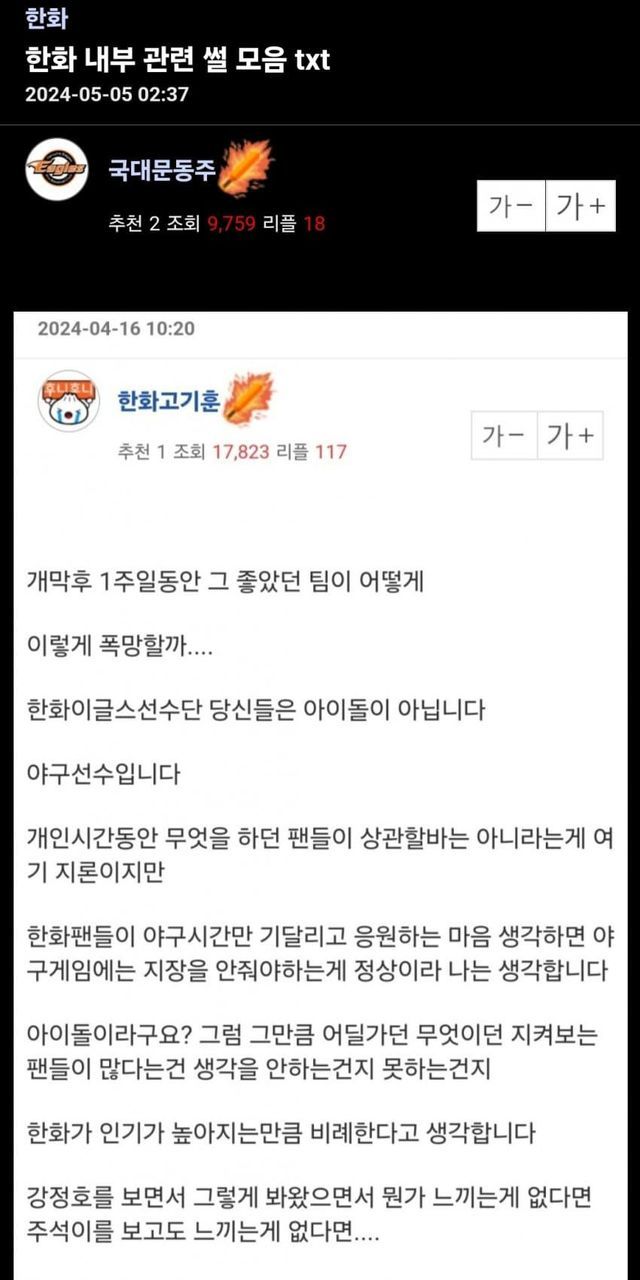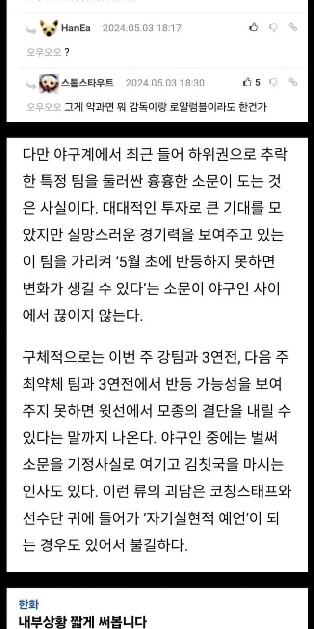 지들 전력이 진짜 좋다고 착각함. 현실은 8점대 문동주 5점대 제이크 우르크 100도 못 치는 안치홍 채은성이 팀 중심 ㅋㅋㅋ