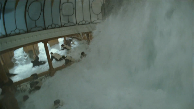침수되는 중앙계단의 기둥을 잡고 버티는 한 남자…