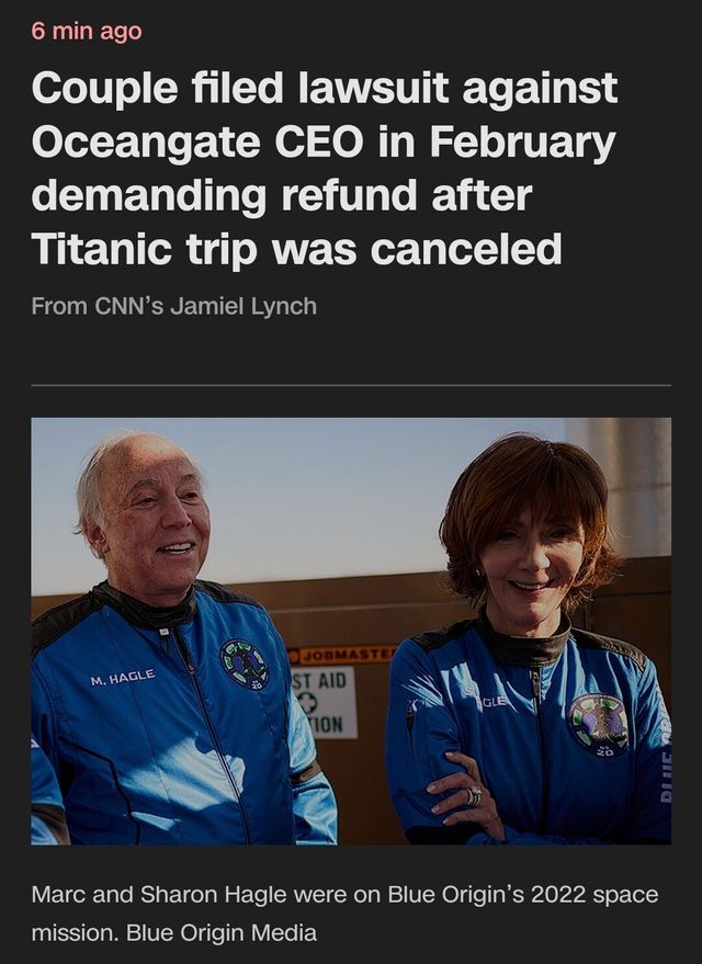 러시는 일요일에 실종된 잠수정에 탑승하고 있다. CNN은 소송에 대한 논평을 위해 오션게이트에 연락했다. 플로리다 제9사법회로의 온라인 문서에는 현재 소송에 대한 반응이 없습니다.