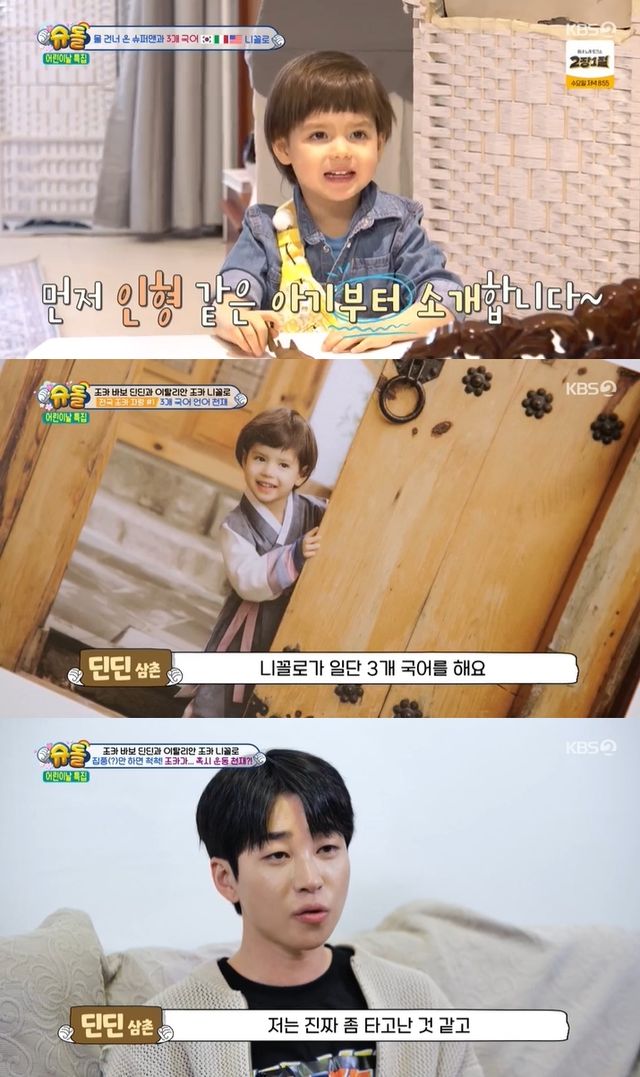 딘딘은 "니꼴로가 3개국어를 한다. 매형과 누나가 영어로 대화하다 보니"라며 "언어 천재 같기도 하다"고 팔불출 면모를 드러냈다.