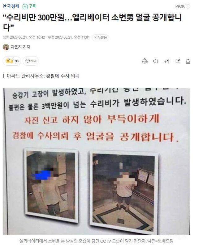 출처 : “수리비만 300만원…엘리베이터 소변男 얼굴 공개합니다” (naver.com)