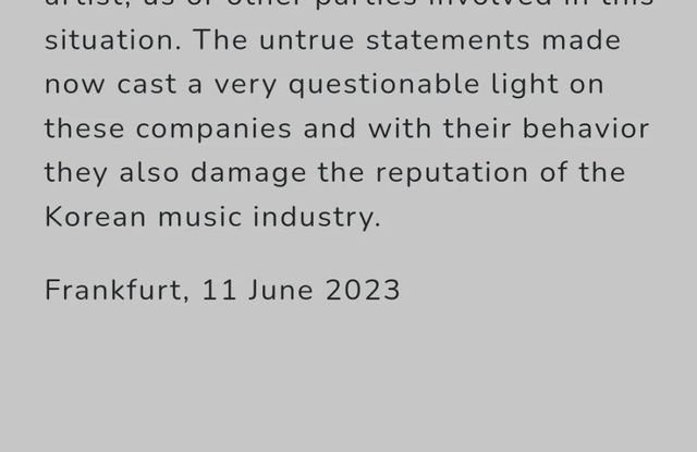 유감스럽게도 책임자들은 소속 아티스트, 당사 또는 이번 사태에 연루된 다른 당사자들의 피해를 막는 데 전혀 관심이 없는 것으로 보입니다. 사실이 아닌 진술은 이제 이들 회사에 대해 매우 의심스러운 빛을 비추고 그들의 행동으로 한국 음악 산업의 명성을 손상시킵니다.