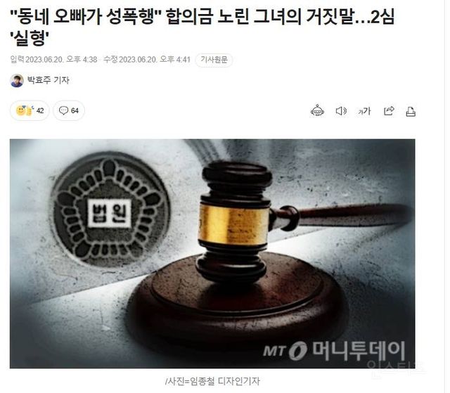 출처 :?동네 오빠가 성폭행 합의금 노린 그녀의 거짓말…2심 ‘실형’ (naver.com)2020년 충남 아산의 한 공원에서 A씨는 동네 오빠에게 성폭행을 당했다고 신고했다.이후 경찰서에 출석해 동네 오빠로부터 강 간 당했다고 진술했지만조사 결과 A씨는 교통사고 합의금과 사업자금 등 돈이 필요해지자 형사 합의금을 받아낼 목적으로동네 오빠를 무고한 것으로 드러났다.A씨는 과거에도 같은 범행으로 실형을 선고받아 약 5개월간 수감생활을 한 것으로 알려졌다.감옥에 더 오래 썩어봐야 정신 차릴 듯