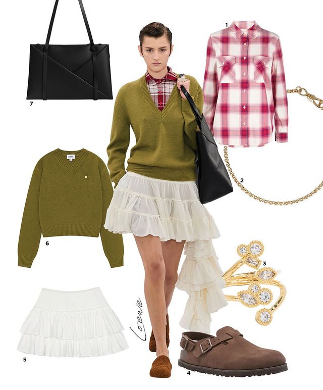 1 체크 셔츠는 25만원대 Woolrich by Farfetch. 2 앵클릿은 36만원대 Otiumberg. 3 반지는 16만원대 Maje. 4 로퍼 샌들은 65만원대 Birkenstock by Farfetch. 5 티어드 스커트는 15만원대 The Centaur. 6 브이넥 스웨터는 10만원대 Covernat. 7 숄더백은 15만원대 Charles & Keith.