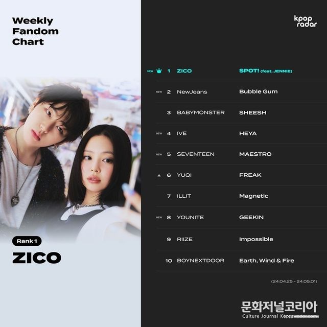이번 주 차트에서는 지코가 블랙핑크 멤버 제니와 함께한 신곡 ‘스팟!(SPOT! (feat. JENNIE))’으로 1위를 차지했다.