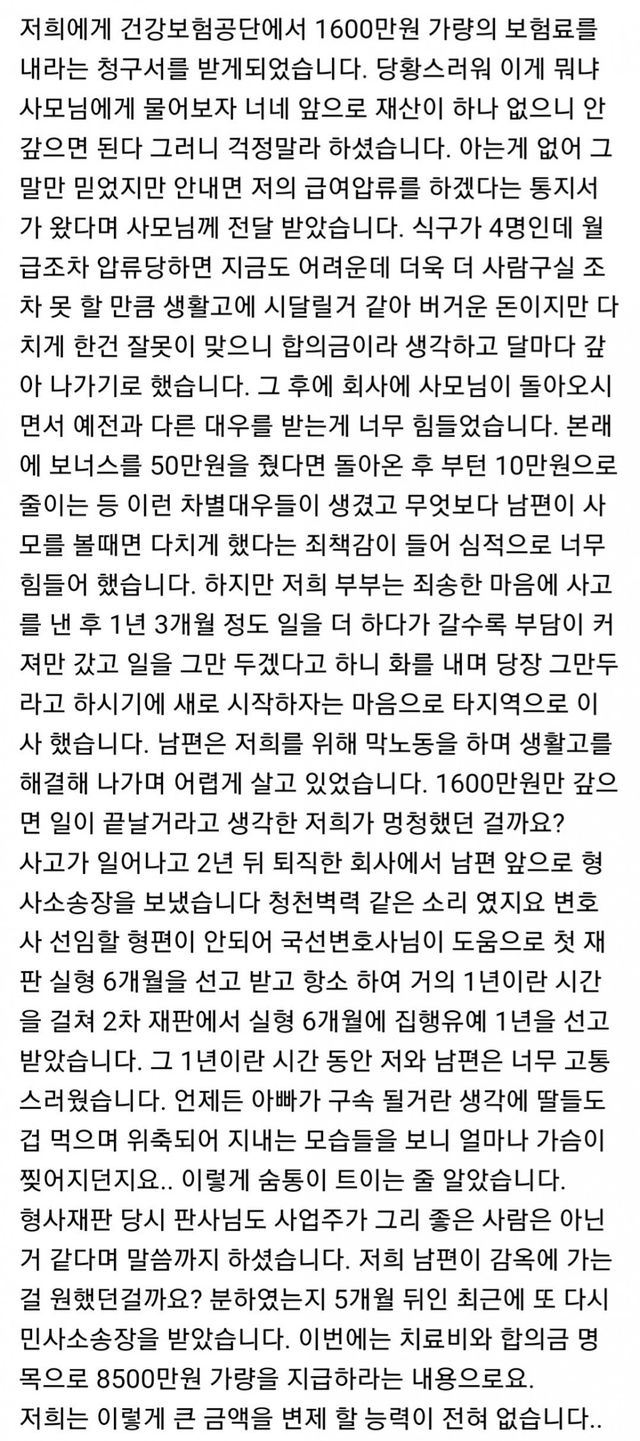 운행하던중 회사 대표 마누라 사모를 다치게함