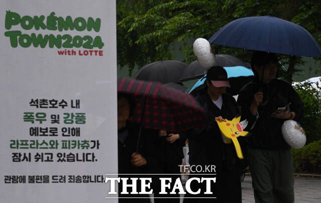 롯데는 어린이날 연휴 강풍과 비 예보에 잠실 롯데월드타워·몰에서 진행중인 '포켓몬 타운' 야외 일부 행사를 우천 시 일시 휴장하기로 했다. 이에 따라 석촌호수 동호에 16m 높이로 띄운 포켓몬 '라프라스'와 '피카츄' 대형 아트벌룬은 5~6일 바람을 빼고 납작하게 수면 위에 깔아뒀다.